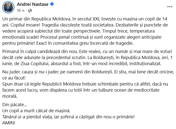 Din păcate…Un copil a murit călcat de mașină. Tânărul și-a pierdut viața, iar șoferul a câștigat din nou o primărie”, a scris Andrei Năstase.