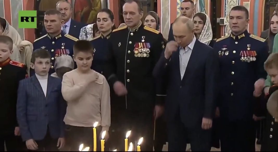 Potrivit agenției ruse de presă de stat TASS, Putin a participat toată noaptea la slujbă, care a avut loc la Biserica Marelui Mucenic Gheorghe Învingătorul, lângă Moscova.