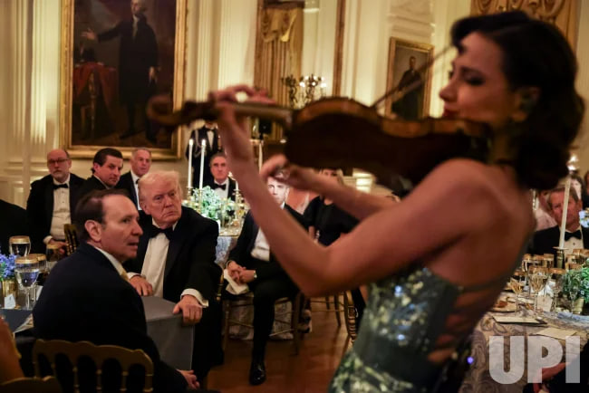 Președintele SUA, Donald Trump, o urmărește pe violonista moldoveană Rusanda Panfili interpretând în timpul cinei guvernatorilor din Salonul de Est al Casei Albe, sâmbătă, 21 februarie 2026, la Washington