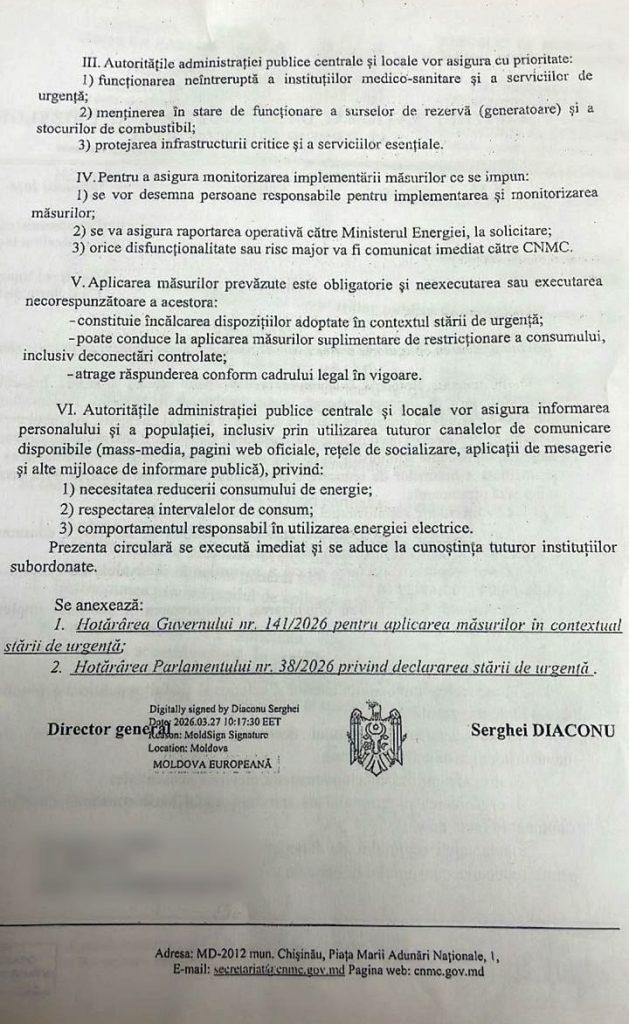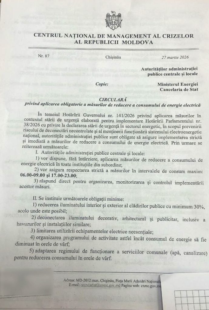 Centrul Național de Management al Crizelor a emis o circulară către autoritățile publice locale prin care solicită aplicarea urgentă a unor măsuri de economisire a energiei electrice. Decizia vine în contextul menținerii stării de urgență, chiar dacă linia electrică Isaccea–Vulcănești a fost deja reparată și este funcțională.