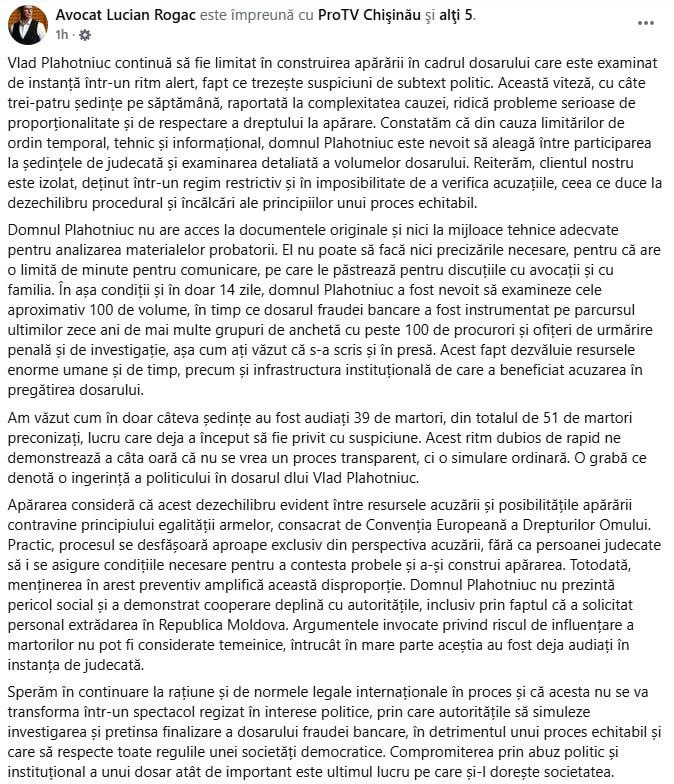 „Vlad Plahotniuc continuă să fie limitat în construirea apărării în cadrul dosarului care este examinat de instanță într-un ritm alert, fapt ce trezește suspiciuni de subtext politic. Această viteză, cu câte trei-patru ședințe pe săptămână, raportată la complexitatea cauzei, ridică probleme serioase de proporționalitate și de respectare a dreptului la apărare. Constatăm că din cauza limitărilor de ordin temporal, tehnic și informațional, domnul Plahotniuc este nevoit să aleagă între participarea la ședințele de judecată și examinarea detaliată a volumelor dosarului”, a declarat avocatul Lucian Rogac.