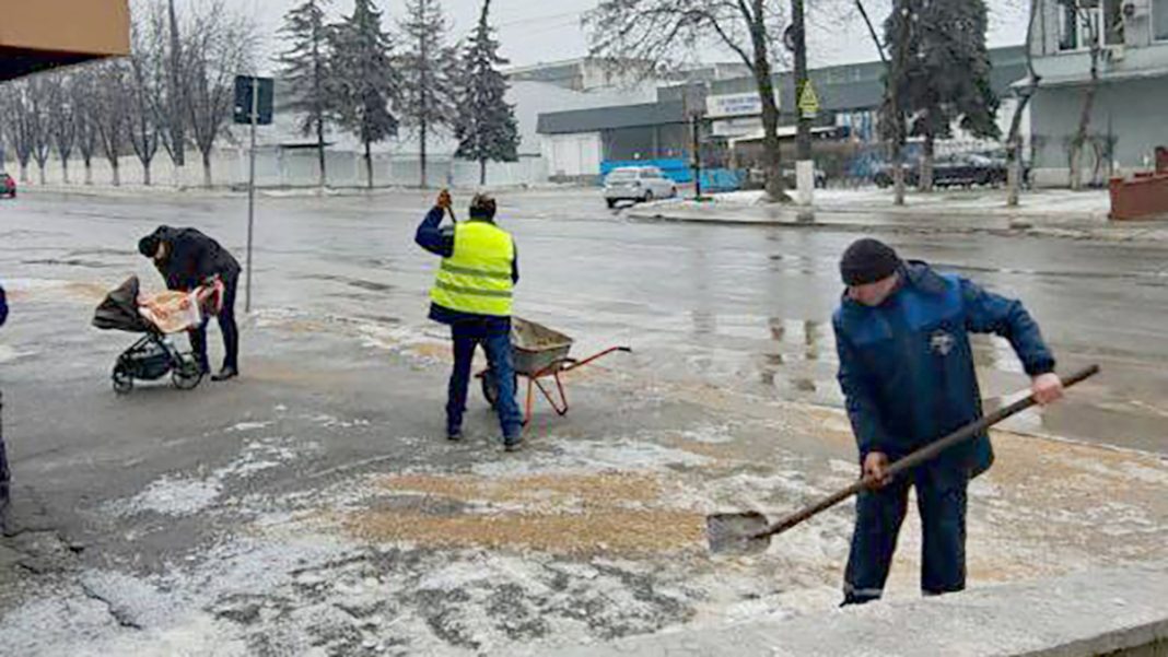 Primăria Municipiului Chișinău constată că în urma lapoviței și a temperaturilor scăzute, pe mai multe trasee și trotuare s-a format ghețuș. În astfel de condiții, cea mai eficientă măsură este aplicarea materialului antiderapant – amestec de sare și nisip. Pe unele străzi, intervențiile sunt efectuate repetat, în funcție de situația din teren.