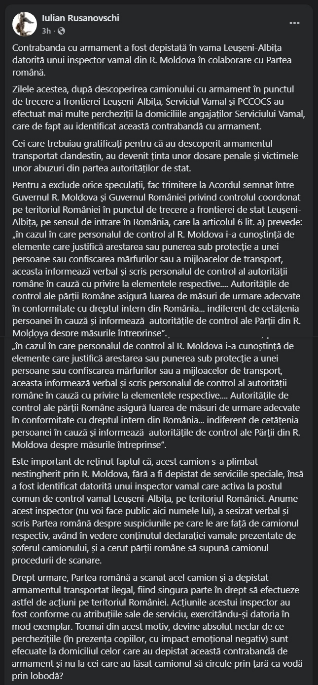 Pentru a exclude orice speculații, fac trimitere la Acordul semnat între Guvernul R. Moldova și Guvernul României privind controlul coordonat pe teritoriul României în punctul de trecere a frontierei de stat Leușeni-Albița, pe sensul de intrare în România, care la articolul 6 lit. a) prevede: „în cazul în care personalul de control al R. Moldova i-a cunoștință de elemente care justifică arestarea sau punerea sub protecție a unei persoane sau confiscarea mărfurilor sau a mijloacelor de transport, aceasta informează verbal și scris personalul de control al autorității române în cauză cu privire la elementele respective…. Autoritățile de control ale părții Române asigură luarea de măsuri de urmare adecvate în conformitate cu dreptul intern din România… indiferent de cetățenia persoanei în cauză și informează autoritățile de control ale Părții din R. Moldova despre măsurile întreprinse”, scrie Iulian Rusanovschi pe Facebook