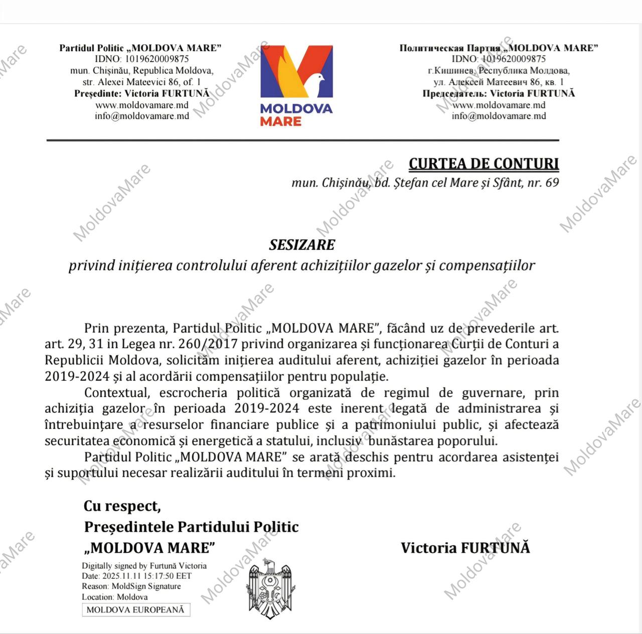 Victoria Furtună, liderul Partidului ”Moldova Mare”, cere Curții de Conturi să inițieze un audit al achiziției de gaze din perioada 2019-2024, precum și controlul acordării compensațiilor populației.